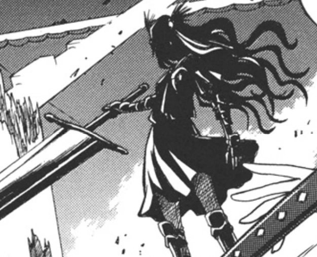 She usually wields a 1.5m claymore, an exceedingly wide double-edged sword used to slice an enemy in two, armor and all, with brute strength. However, she doesn't just rely in her overwhelming strength: in their first clash Kanzaki could notice Brunhild had honed her abilities with the sword through rigorous training like her.[1]
