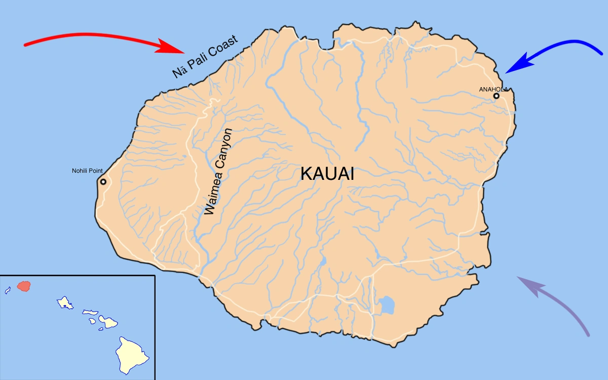 Map showing the assumed movement of the forces of Kauai in the invasion, just before the start of the battle. Inset shows Kauai in relation to the rest of the Hawaiian Islands