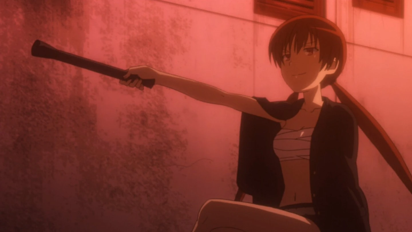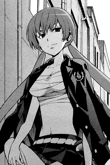 She is a girl with long dark red hair tied into two low ponytails. Instead of wearing the Kirigaoka Girls' Academy uniform's dark blue coat the usual way, she wears it over her shoulders instead like a cape, wearing only a pink crop top and a pleated skirt. At times though, she is only seen with bandages to cover her breasts instead of wearing a crop top. She carries around a military flashlight, used to help her aim properly when she uses her ability, on her belt at all times.