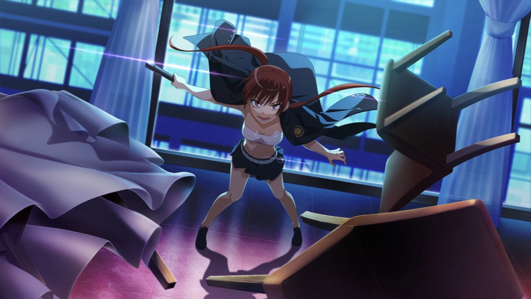 Because of the AIM Jammer, Motoharu couldn't rely on Awaki and her power. Not knowing how Megumi would attack, Motoharu was careful on not approaching her carelessly. Motoharu took his gun and shot an even scattering of bullets to stop Megumi from escaping. As a response to this, Megumi kicks up the bag of explosives Tatsuhiko was using to stop Motoharu's shooting. Seeing him stop to avoid hitting the explosives, Megumi runs toward him as he tries to shoot at her. She bends down, missing his shot. Before Motoharu could adjust his aim, she tackled him down square in the gut. The force was powerful enough to hurl Motoharu a few meters back. Motoharu asks if what she is doing is an Anti-Skill technique, but Megumi says that if it was used by Anti-Skill the children would get killed. As they spoke Motoharu fired his gun, but she easily dodge his shots. As the clip of Motoharu's gun emptied, Megumi went towards him and took the gun from him. Once again Megumi tackled him to the wall, knocking him out this time.[8]