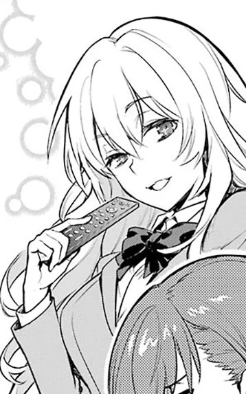 Her power allows her to prevent the use of powers, movement, and even sense of pain of other people using the remote. Also, unique to the power is that some of the people that have been tampered and controlled by Shokuhou display star markings (Shokuhou's eyes have stars on them) on one or both their eyes.[13] She can take-over a person and use their body to interact with other people in long distance. She has the ability to control up to 10-14 people at once using her full power.[4][7] She can also control large number of people, up to triple digit, but she can only give them simple commands.[4] Using her powers, she was able to give preset commands to each student of all five schools in the School Garden, and is able to switch between them constantly if she needs to.[4] In addition, she can remove people's memory just by touching them.[14] She is also able to use her ability on herself [15] and apply mental blocks to prevent Mental Out being used against her, though these blocks only work while she is conscious.[5] She can even use her ability to swap out concepts, like the concepts of limiter release code and self-destruct code, in people's minds, as she did on herself to trick Gensei.[6] Outside of the human mind, Shokuhou can make use of her powers to recall an object's residual memory like a form of Psychometry. Shokuhou touches an object with her bare hand, and then presses a remote control on herself to extract its memories. She can extract memories from an object from the past 24 hours.[11] She can use the same application on herself even extracting her memories of the past year.[16]
